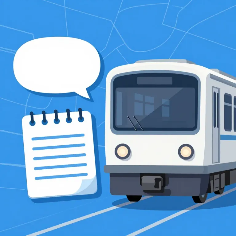 A sleek modern train is depicted with a speech bubble and notepad in the midground, set against a vibrant blue background. The soft, diffused daylight highlights the train's glossy surface, creating a clean and minimalistic backdrop.