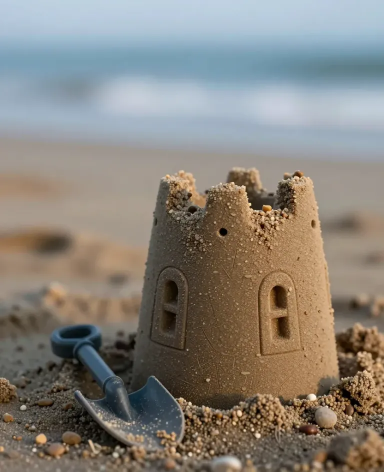 A close-up of a sandcastle turret with a rough, textured surface, bathed in warm, golden sunlight. The blurred beach and ocean in the background provide depth and context.