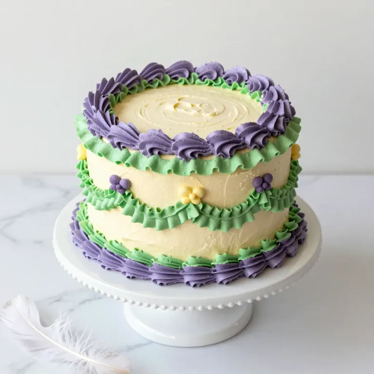 A beautifully decorated buttercream ruffle cake with a soft, diffused light highlighting the glossy frosting and creating gentle shadows. The clean, white marble background emphasizes the cake's elegant design and vibrant color palette.
