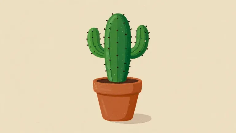 A tall cactus with rough spines stands in a glossy terracotta pot under soft, diffused light, creating gentle shadows and highlights. The simple beige background slightly blurs to emphasize the cactus and pot, offering ample copy space for design elements.
