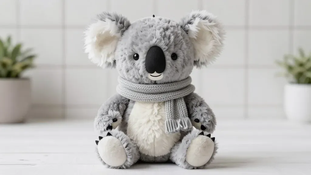 A soft, fluffy plush koala adorned with a hand-knitted scarf sits on a white tiled floor, with diffused lighting highlighting its texture and casting gentle shadows. The slightly blurred background of potted plants adds depth to the composition, making it ideal for product or lifestyle imagery.
