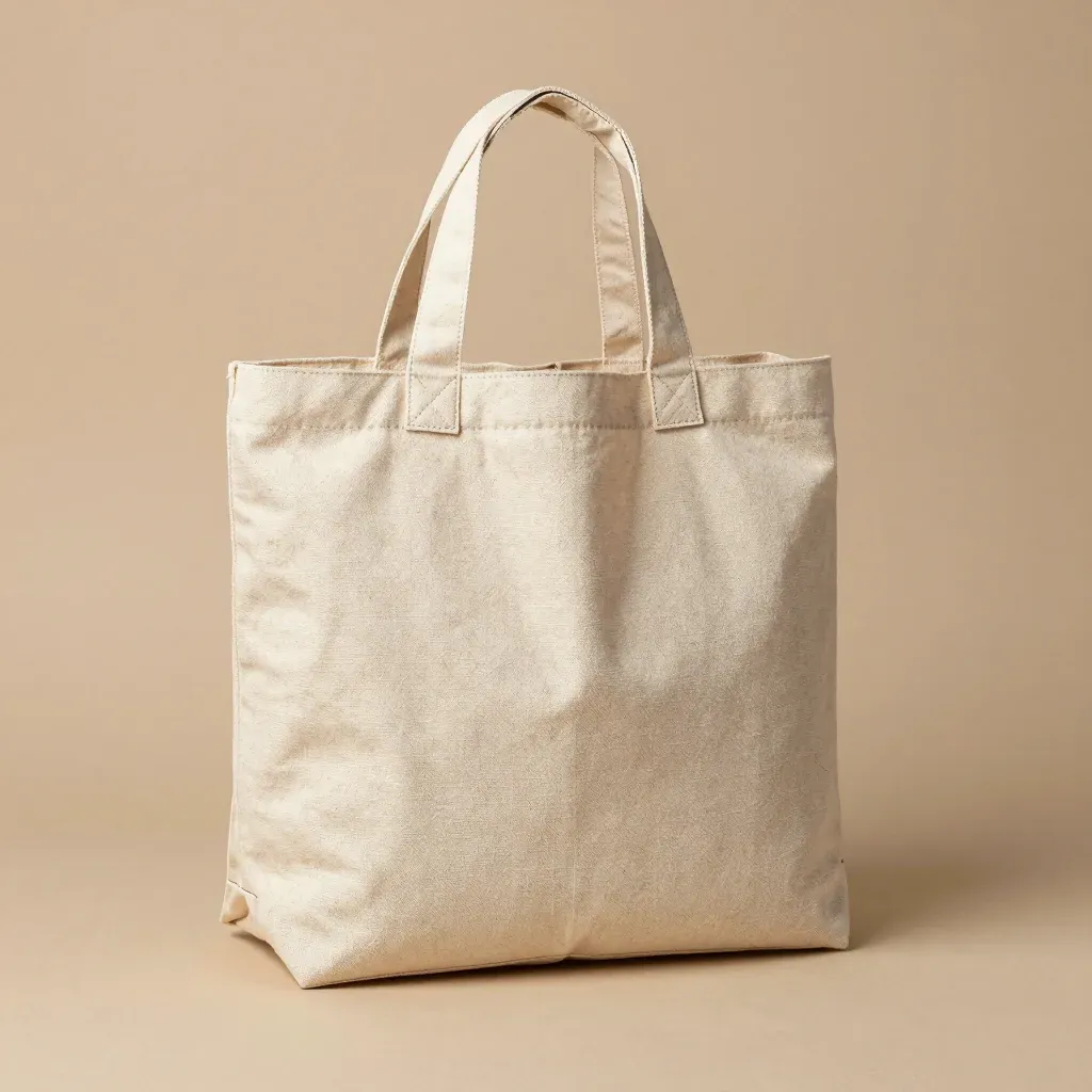 A neutral beige, soft-toned canvas tote bag with rough texture and soft handles, softly lit from the front, creating gentle shadows and highlights. The uniform, blurred neutral beige background emphasizes the bag's clean and minimalistic design.