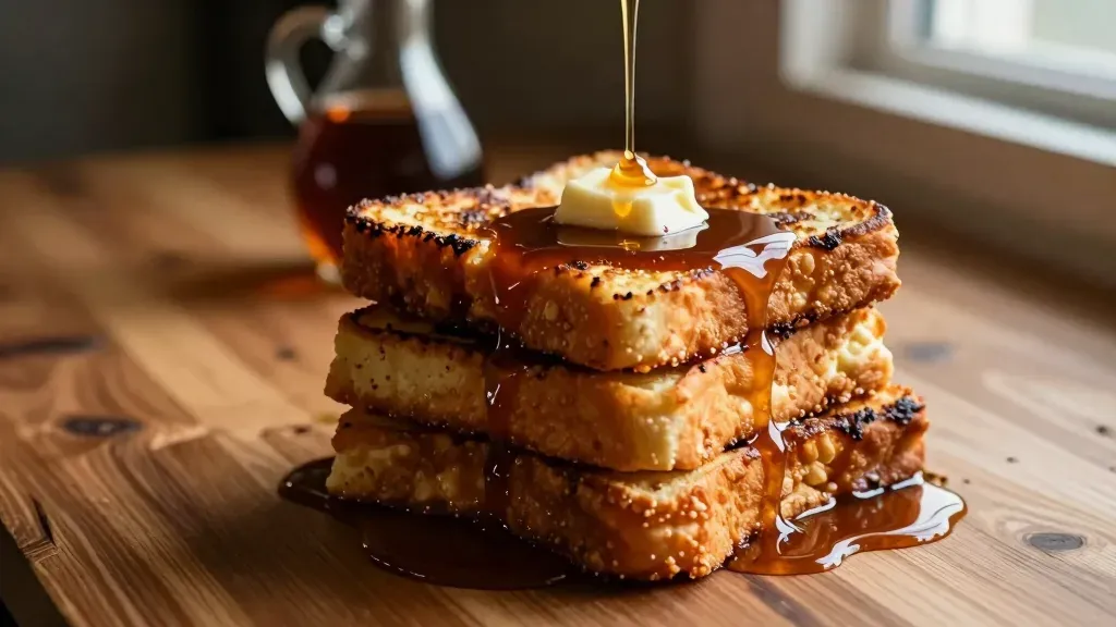 A close-up of a slice of French toast with glossy maple syrup and soft butter, highlighting the golden texture and warm tones. The soft natural light enhances the glossy syrup and the crispy edges, creating a shallow depth of field that draws attention to the subject against a blurred wooden table background.