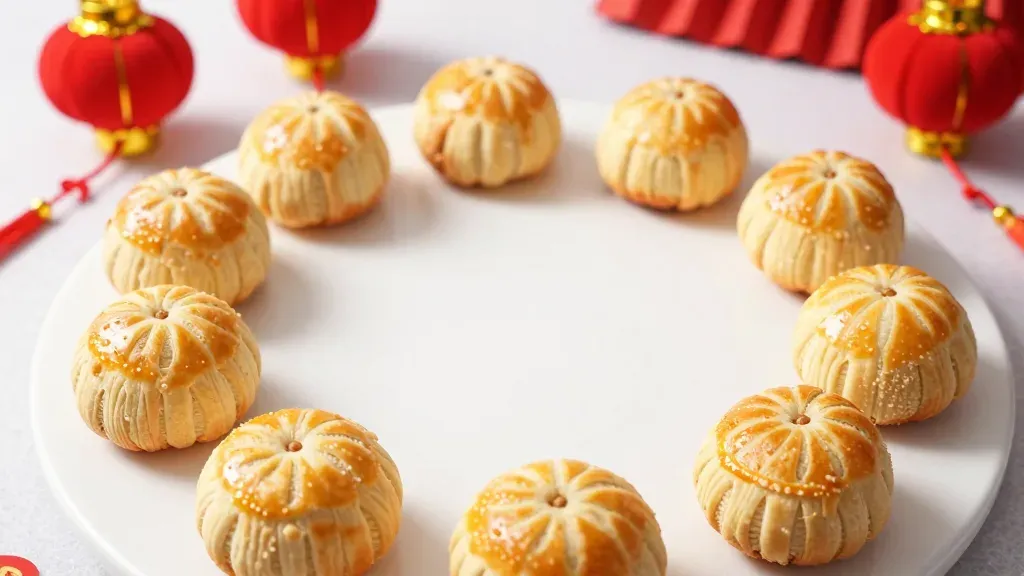 A circular arrangement of golden, flaky pastries with crimped edges and sesame seed sprinkles, set against a backdrop of red lanterns and soft, diffused lighting. The composition and warm tones create a festive and traditional setting, ideal for culinary or cultural themes.