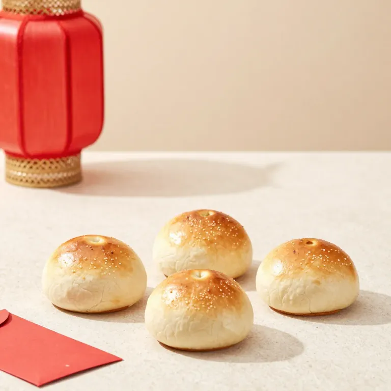 Soft, slightly cracked golden-brown buns with sesame seeds glisten under warm, diffused lighting, creating a visually appealing texture. The shallow depth of field and red lantern in the background add a festive touch, making the image ideal for culinary and festive content.
