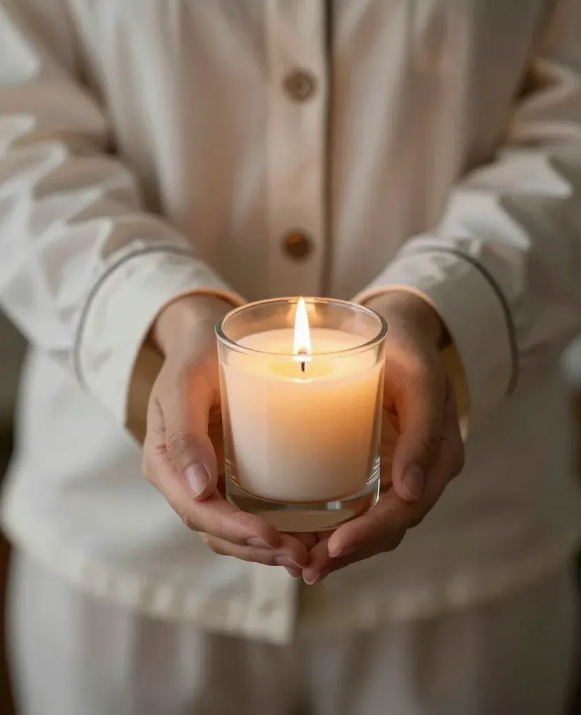 Close-up of hands cradling a lit candle with creamy wax and glossy glass, illuminated by a warm, flickering flame that casts soft highlights on the skin and fabric. The shallow depth of field isolates the subject against a blurred, neutral-toned background, emphasizing the intimate, serene moment.