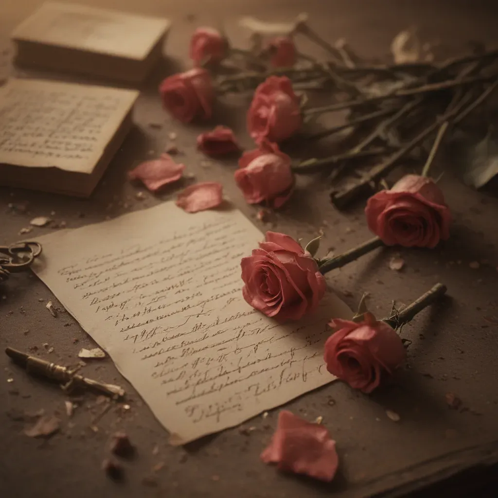 A close-up of wilted pink roses and handwritten letters on a textured, sepia-toned desk, bathed in diffused, warm light that creates soft shadows and highlights. The shallow depth of field draws attention to the roses and letters, evoking a sense of nostalgia and abandonment.