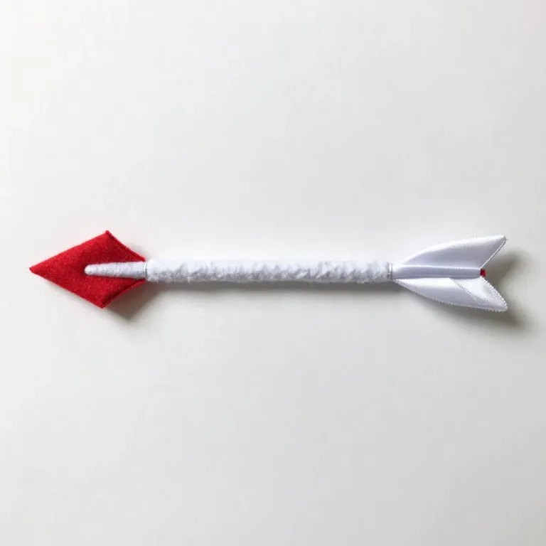 A soft, fuzzy white shaft with a glossy red feathered tip, illuminated by diffused light from above, creating gentle highlights. The arrow is centered and diagonally placed against a pure white background, emphasizing its clean and simple design.