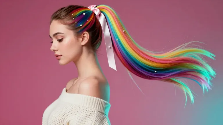 A young woman showcases a vibrant rainbow-colored ponytail with glossy, soft knit sweater. Diffused, soft lighting highlights the hair's colors and the sweater's texture, creating a visually striking image with a blurred, minimalistic background.