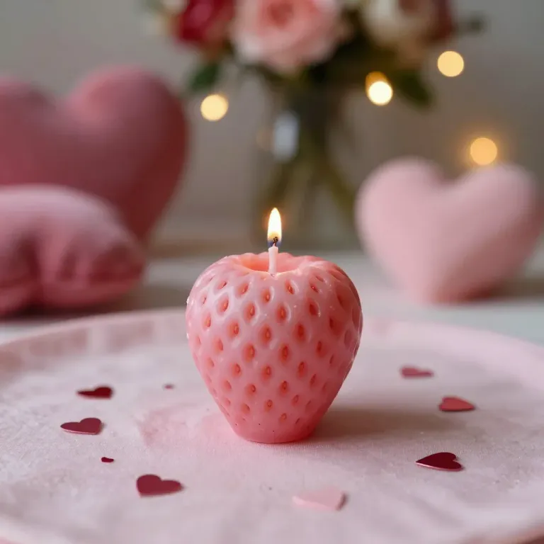 A strawberry-shaped candle with a lit wick and a dotted texture, surrounded by pink heart confetti, set against a soft, warm ambient light and a romantic background with blurred pink flowers and heart-shaped decorations. The balanced composition and gentle glow create a cozy and inviting atmosphere.