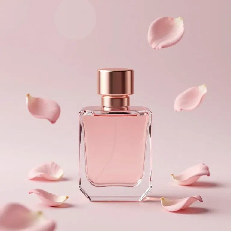 A crystal-clear perfume bottle with a rose-gold cap is centered against a soft pink gradient background, with delicate rose petals floating around it, creating a dreamy, airy effect. The soft, diffused pink light highlights the bottle and petals, emphasizing their delicate textures and colors.