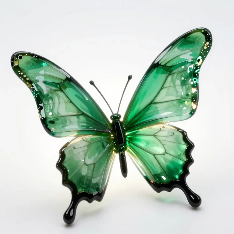 A translucent emerald-green glass butterfly with intricate silver veining and a glossy finish, softly lit to highlight shimmering reflections on its wings. The plain white background ensures the butterfly remains the focal point, creating a balanced yet dynamic composition.