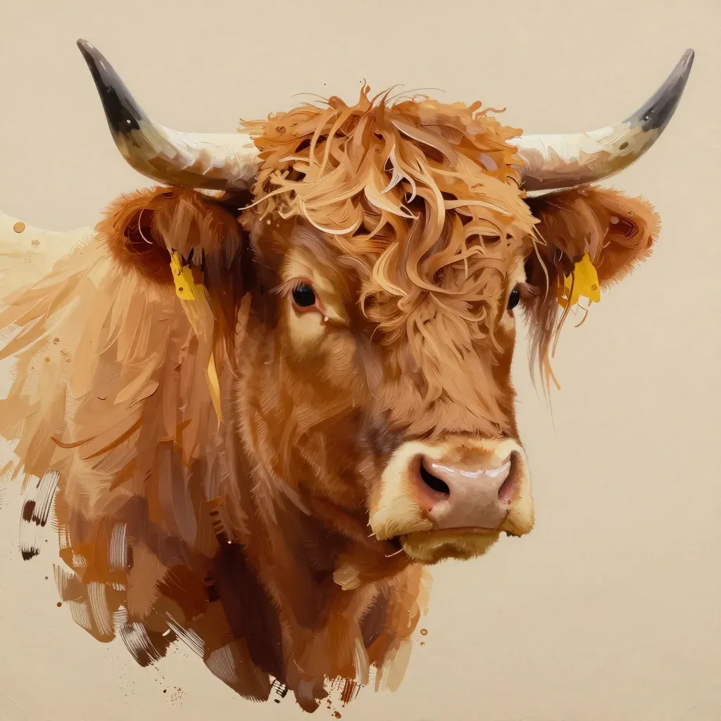 A close-up of a Highland calf with a fluffy, golden-brown mane and prominent horns, bathed in warm, soft light that highlights the texture of its fur. The neutral beige background ensures the focus remains on the calf's detailed features and the interplay of light and shadow on its coat.