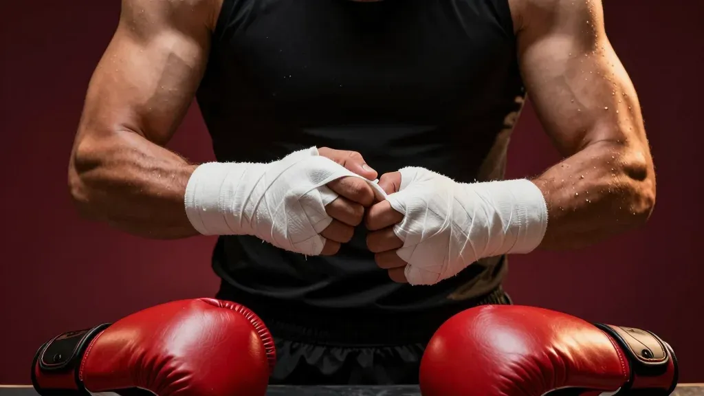 A boxer meticulously wraps his hands with thick white bandages, set against a dramatic deep maroon background that enhances the muscular definition and glossy red boxing gloves in the foreground. The sharp lighting and shallow depth of field emphasize the subject, creating a powerful and focused composition.