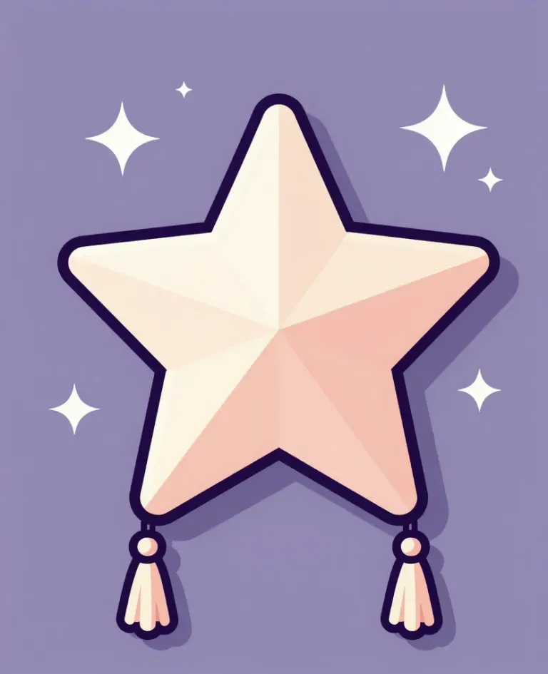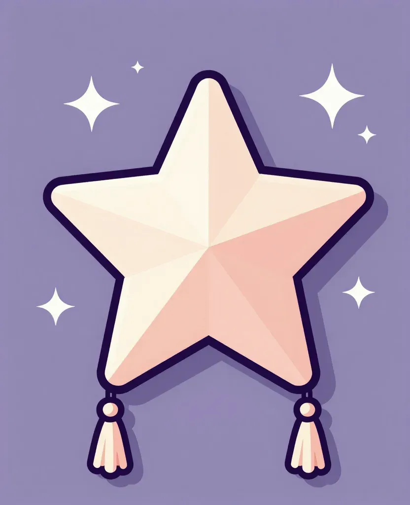A star-shaped piñata with glossy, smooth tassels hangs against a lavender background adorned with small white stars, creating a shimmering effect under diffused, soft lighting. The composition is centered and slightly tilted, emphasizing the piñata's dynamic design.