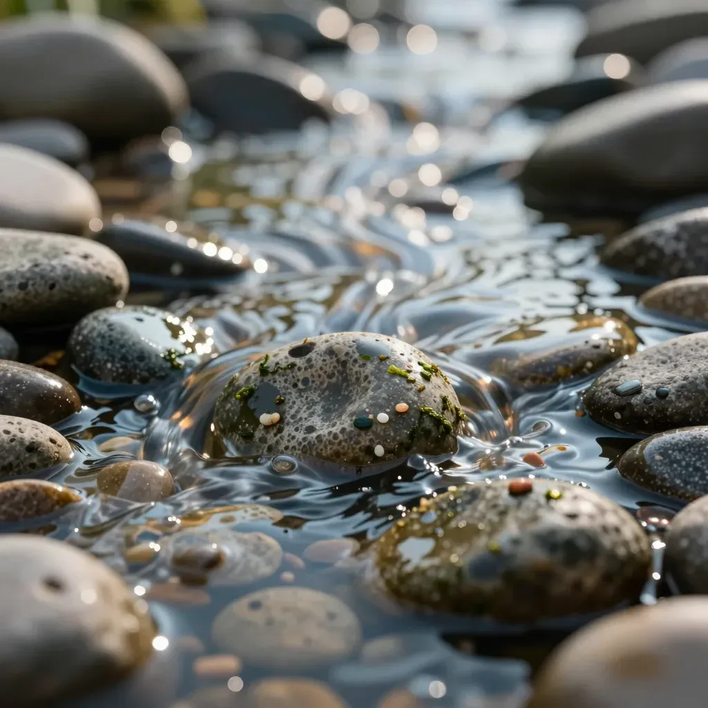 Smooth pebbles glisten in a shallow stream, reflecting dappled sunlight. The shallow depth of field blurs the background, emphasizing the foreground pebbles and water ripples.