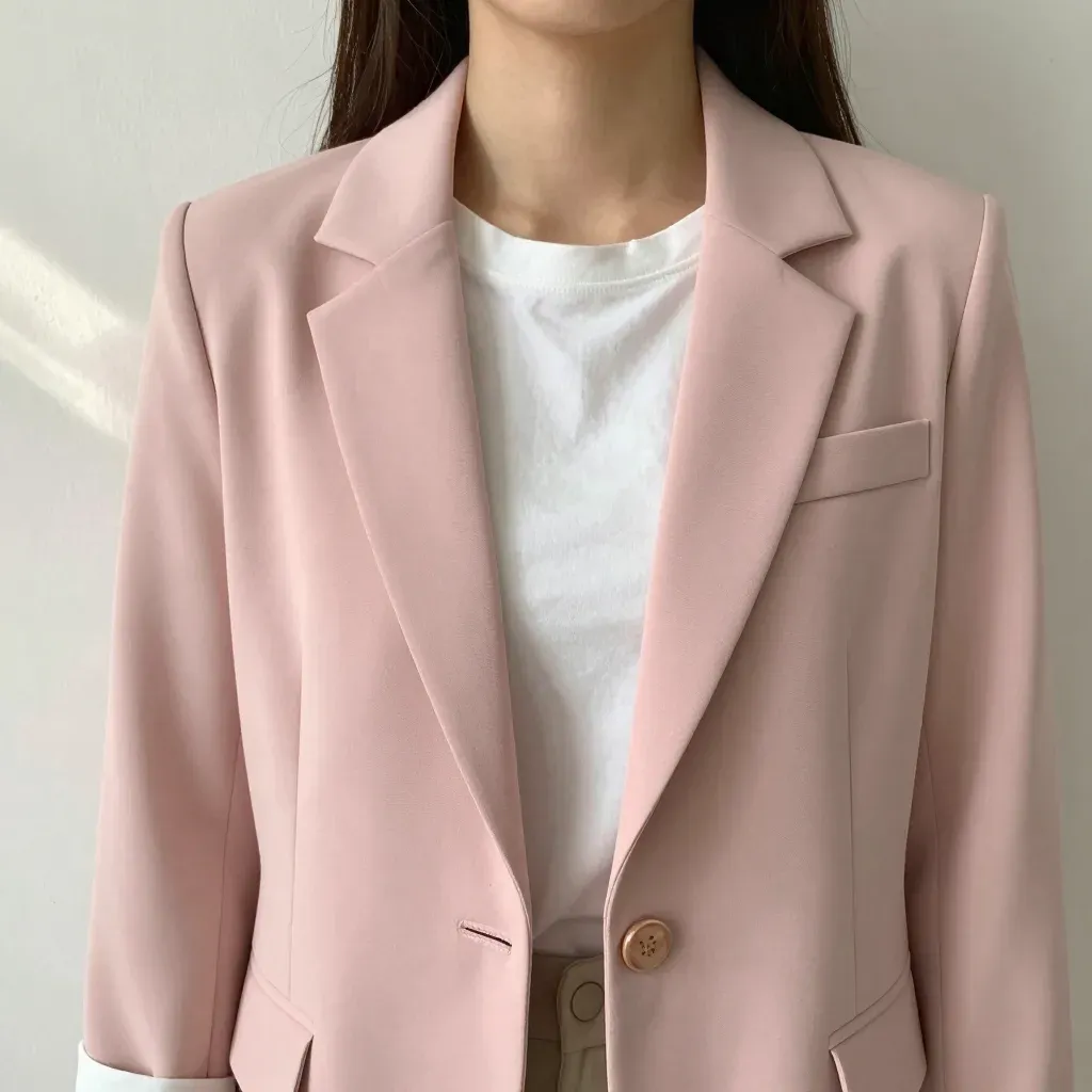 A woman is elegantly dressed in a soft pink blazer layered over a crisp white t-shirt, illuminated by soft, diffused light that accentuates the glossy texture of the blazer and the smoothness of the t-shirt. The close-up shot and centered framing provide a clean, professional look with ample copy space for text overlays.