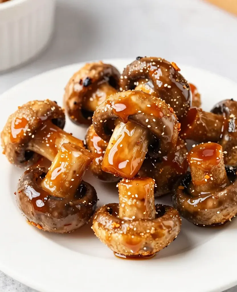 Crisp, caramelized mushrooms are clustered on a white plate, coated in a viscous, amber-colored sweet-savory glaze and sprinkled with toasted sesame seeds. Soft overhead lighting creates subtle highlights on the sauce’s surface, while a shallow depth of field isolates the subject against a neutral grey background with a blurred white ramekin in the upper left.