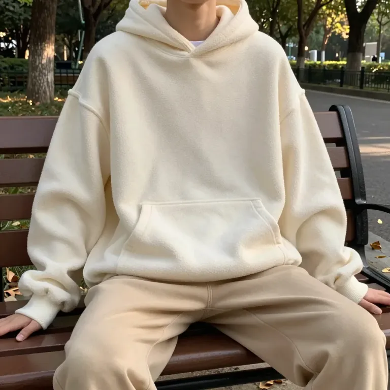 A person sits on a wooden bench in a park, wearing a soft, plush cream-colored hoodie and smooth beige pants, bathed in soft, natural light that highlights the textures of the clothing and creates gentle shadows. The background, slightly blurred, features trees and greenery, adding depth and a serene atmosphere to the composition.