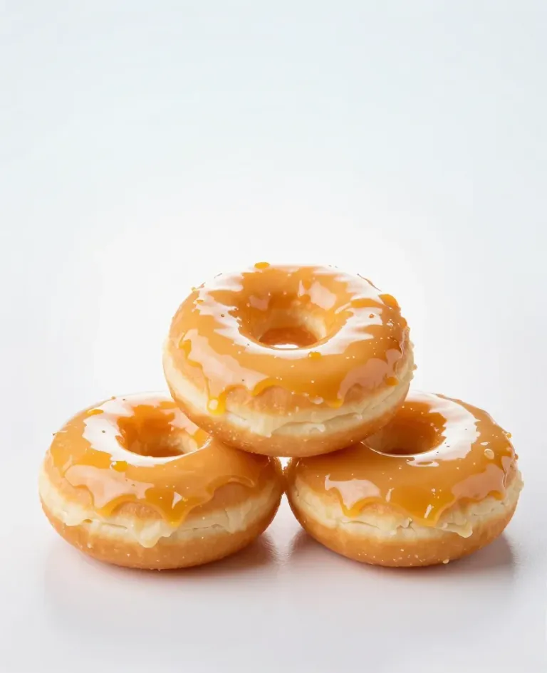 Golden-brown donuts with glossy caramel glaze stacked in a pyramid, illuminated by soft, diffused light that highlights the texture and reflections, creating a visually appealing and appetizing composition.