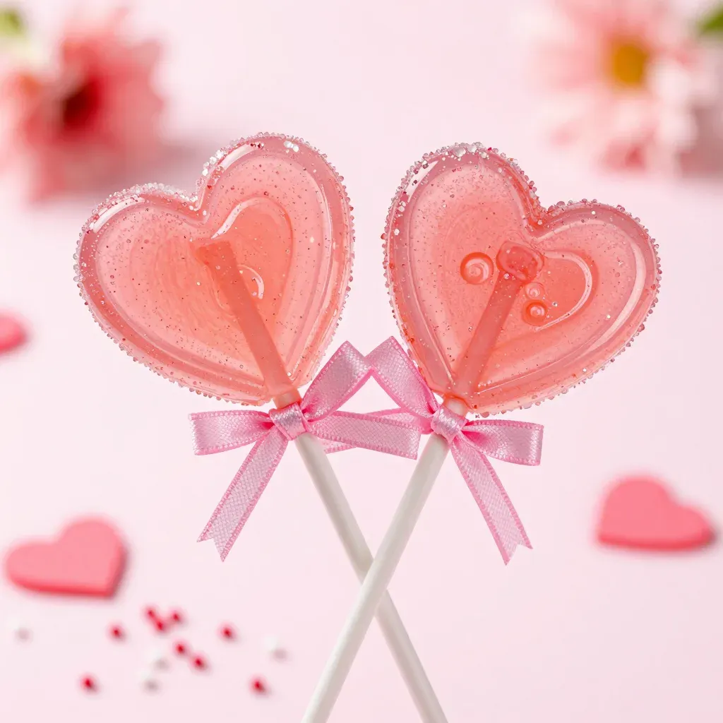 Two glossy, translucent pink heart-shaped lollipops with embedded air bubbles are tied with satin ribbons and crossed diagonally, set against a soft pink backdrop with blurred floral elements. The image features soft front lighting from the upper left, creating subtle highlights and a shallow depth of field that isolates the subject with foreground confetti adding depth.