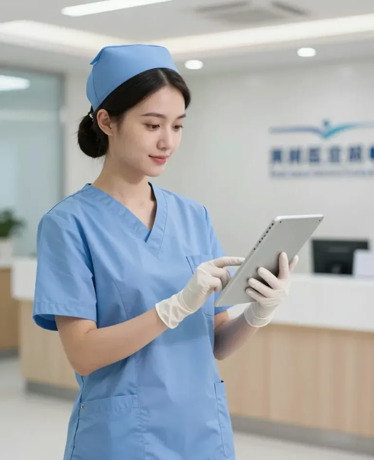 A nurse in blue scrubs and cap is focused on a tablet, with smooth, glossy gloves and soft, plush scrubs. The soft, diffused ceiling light highlights her face and hands, emphasizing her concentration. The clean, modern clinic background with a blurred logo adds depth and context.
