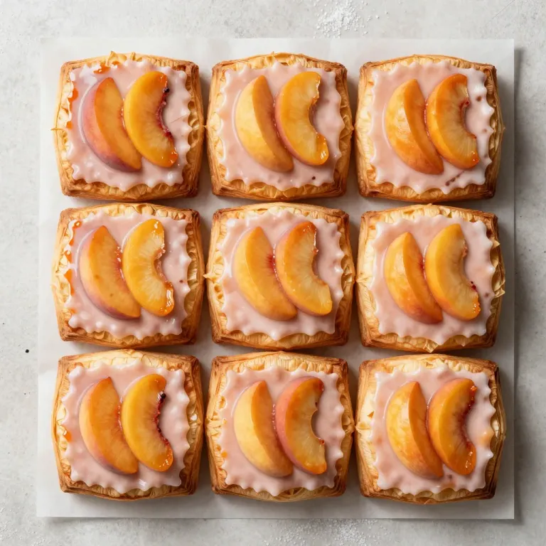 Golden-brown flaky pastry squares topped with glossy peach slices and creamy glaze, arranged in a grid under soft, diffused natural light that highlights the textures and colors, creating a visually appealing and appetizing display.