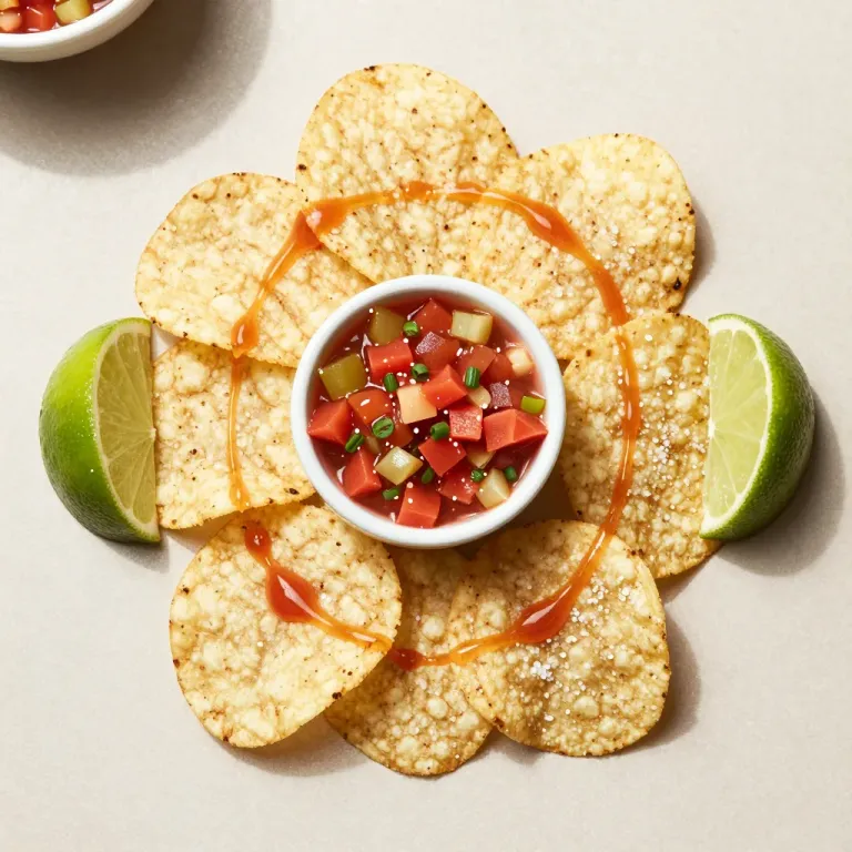 A vibrant salsa bowl is surrounded by crispy corn tortilla chips, drizzled with a glossy sauce, set against a minimalist pale beige background. The soft, diffused lighting highlights the textures and colors, creating a balanced and symmetrical composition.