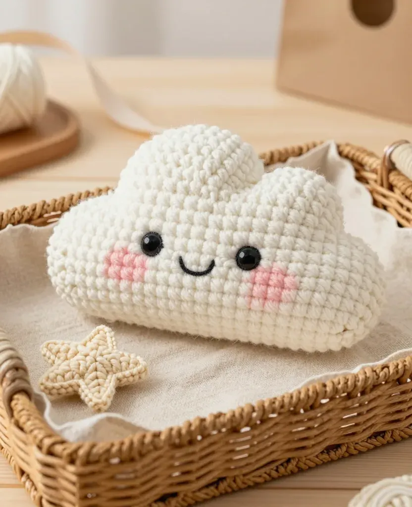 A soft, fluffy crochet cloud plush with rosy cheeks and a smile, illuminated by soft, diffused light, creating gentle shadows and highlights, balanced in a wicker basket with a star-shaped decoration, set against a neutral wooden background.