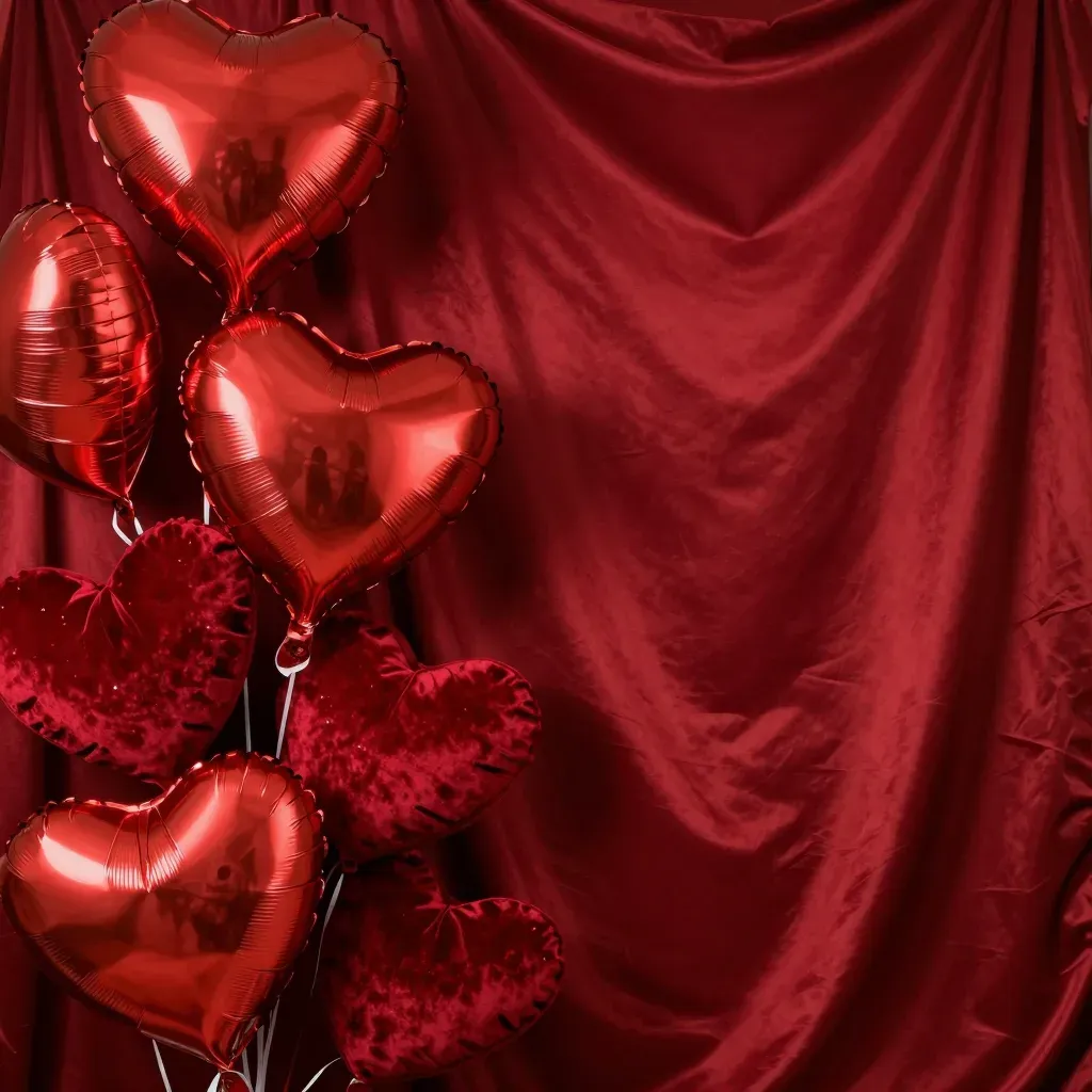 A cluster of heart-shaped balloons gleams in deep crimson, their metallic surfaces reflecting soft, diffused light. The rich, textured background enhances the luxurious and intimate setting, creating a sense of depth and elegance.