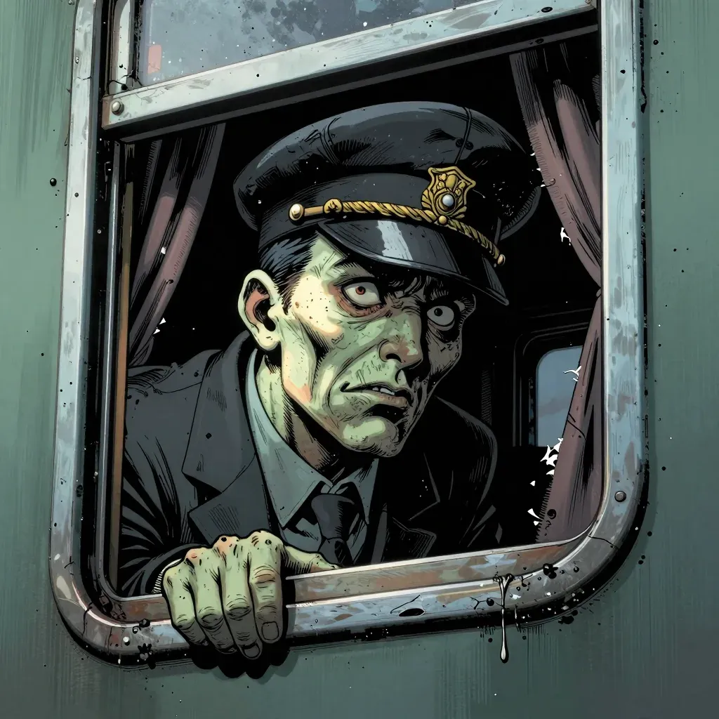 A derelict train conductor leans out of a window, his weathered face illuminated by dim, flickering light. The close-up and shallow depth of field emphasize his grimy uniform and the rough, weathered metal of the train car, creating a sense of isolation and decay.