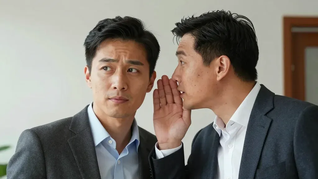 Two men in formal suits engage in a hushed conversation, with one whispering into the other's ear. The soft, diffused lighting and minimalist office background emphasize the intimate and professional interaction.