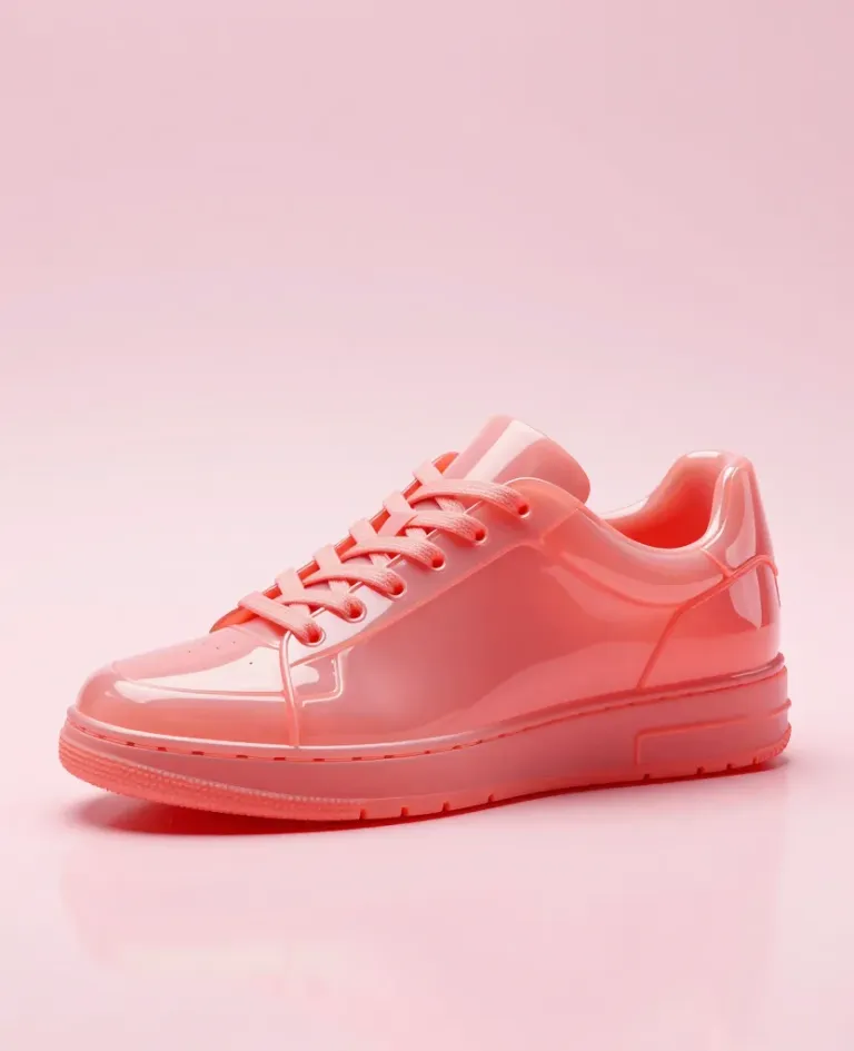 A glossy, translucent acrylic sneaker with soft, diffused lighting highlights its smooth texture and vibrant pink hues. The clean, blurred background provides a minimalistic backdrop, ideal for product photography and branding.