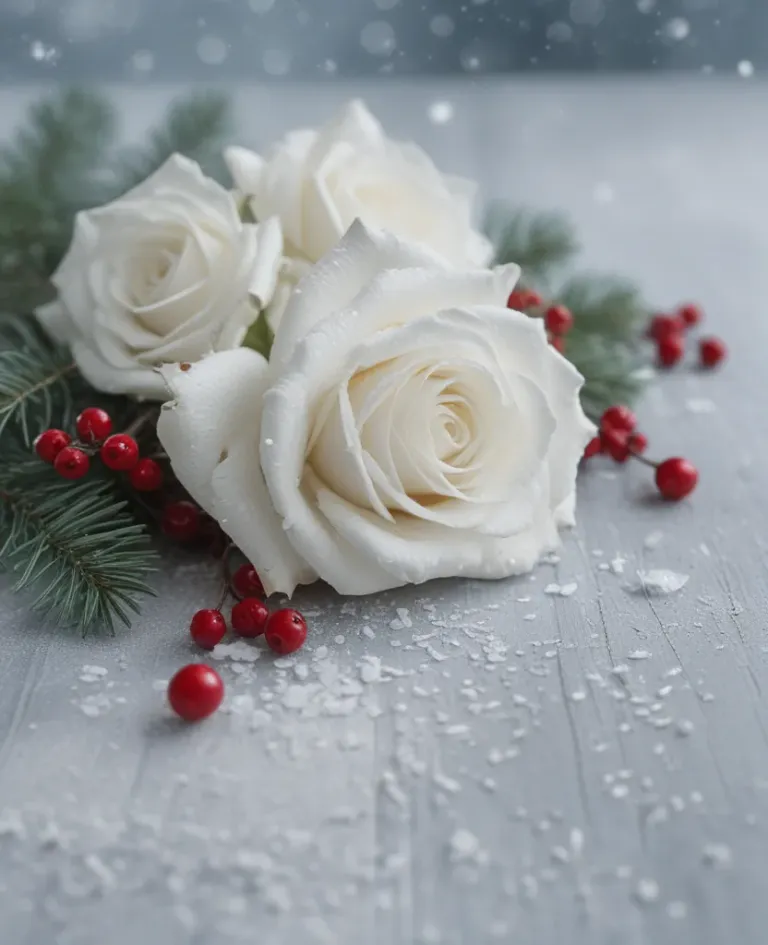 Three pristine white roses and vibrant red berries rest amidst icy crystals, creating a serene winter tableau. The soft, diffused light highlights the delicate textures and glossy surfaces, while the blurred background ensures the subject remains the focal point.