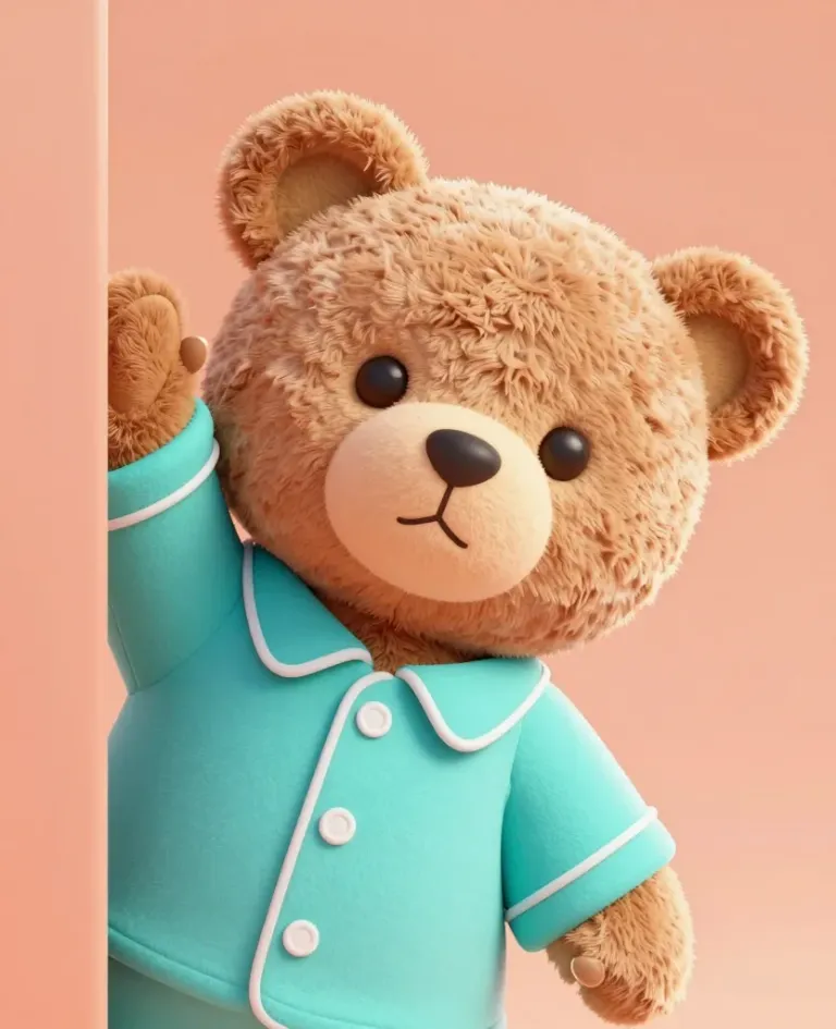 A cozy teddy bear in turquoise pajamas peeks out from behind a peach-colored background, illuminated by soft, diffused light that creates gentle shadows and highlights the plush texture of its fur and glossy pajama fabric. The shallow depth of field and centered composition emphasize the bear, making it perfect for children's or home decor themes.