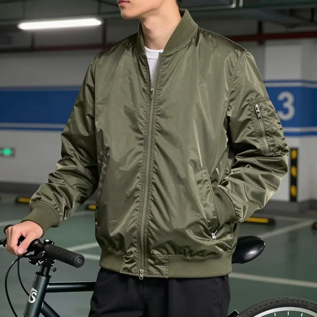 A young man in an olive-green bomber jacket holds a bicycle, with soft, diffused lighting highlighting the glossy fabric and smooth concrete floor. The slightly blurred background of a garage with numbered parking spaces emphasizes the subject and creates a clean, focused composition.