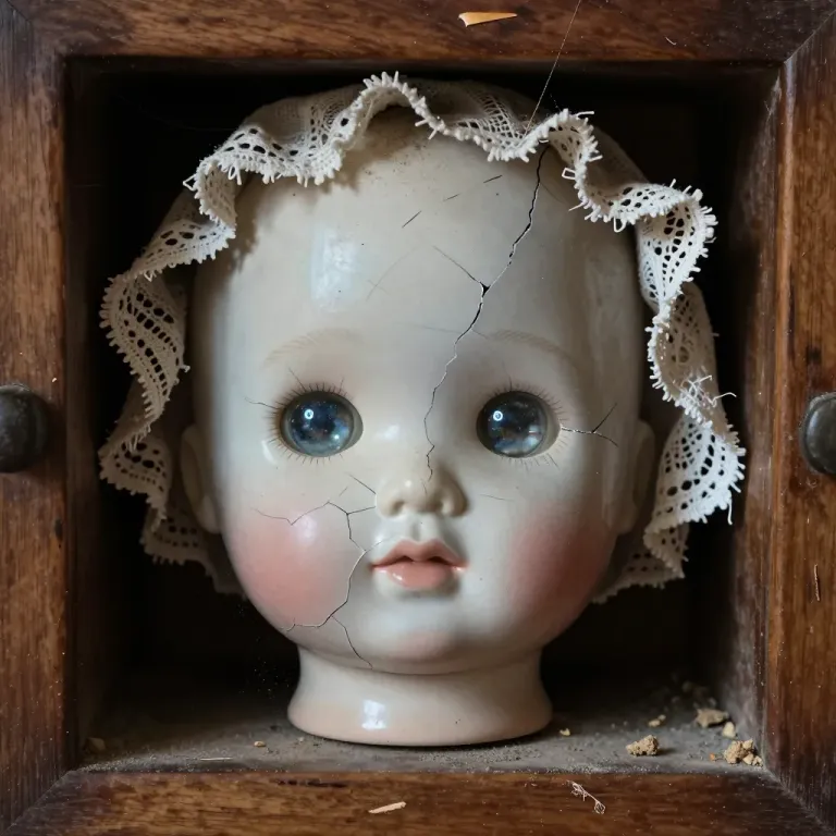 A cracked porcelain doll’s head with a frayed lace bonnet rests in a weathered wooden drawer, its glossy surface catching soft top-down light while deep shadows pool in the crevices. The shallow depth of field isolates the doll’s face, emphasizing its aged textures against the out-of-focus, debris-dusted wood interior.
