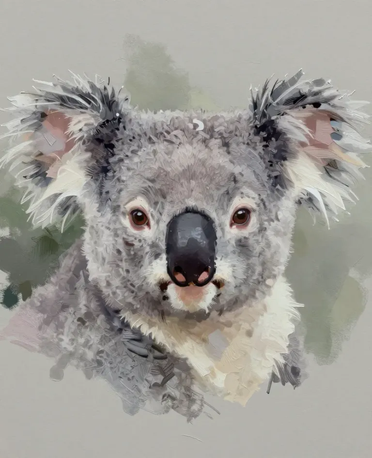 A close-up of a koala's face, showcasing its textured fur and glossy highlights under warm, natural light. The shallow depth of field blurs the background, focusing attention on the koala's expressive features and the soft, muted greens and grays of the natural setting.