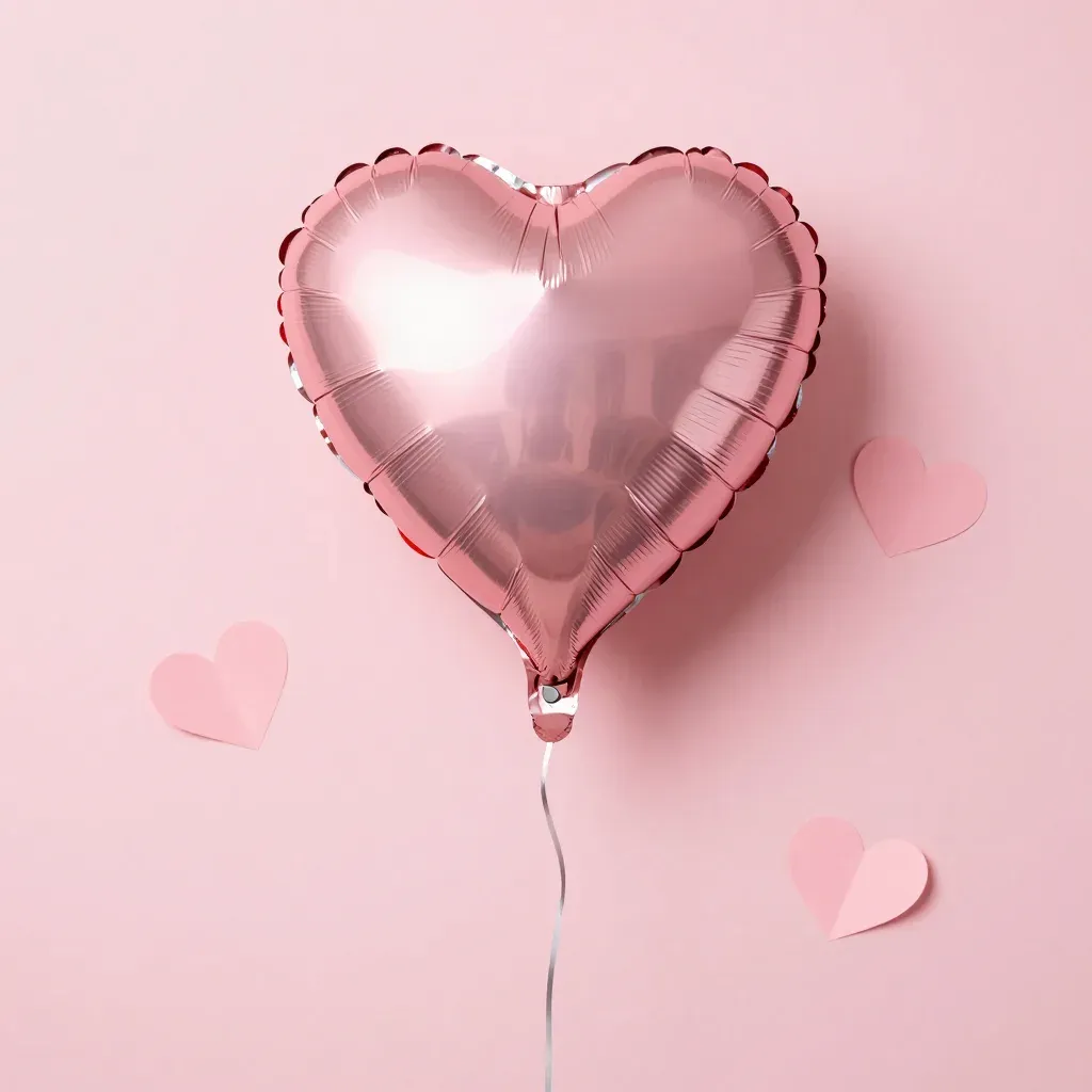 A shiny, reflective rose gold heart-shaped balloon is the focal point, surrounded by smaller heart shapes against a soft pink background. The direct, soft lighting highlights the balloon's metallic sheen, creating a clean and simple backdrop.