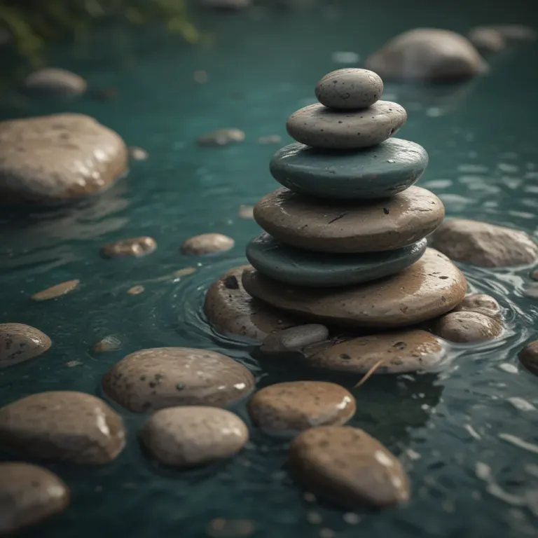 Smooth, rounded stones with a glossy sheen are balanced on the edge of a rippling pool, creating a serene and tranquil scene. The soft, diffused lighting highlights the stones' textures and creates subtle shadows, enhancing the calm atmosphere.