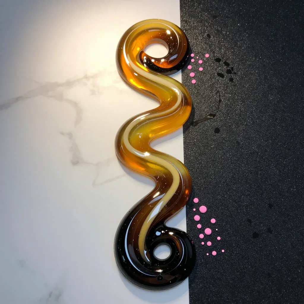 A smooth, glossy amber ink ribbon flows elegantly over a black and white marble background, illuminated by a warm, direct overhead light. The composition is centered and close-up, creating a high-contrast visual with blurred edges.
