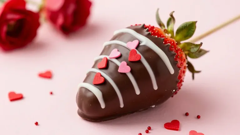 A glossy dark chocolate-coated strawberry on a wooden skewer is adorned with creamy white chocolate drizzle and tiny red heart sprinkles, showcasing a smooth, rich texture and vibrant color contrast. The soft diffused lighting highlights the curved surface with gentle shadows, while the shallow depth of field and pink background with blurred roses create a romantic, elegant composition with ample negative space to the right.