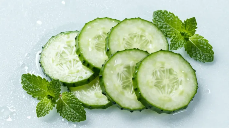 Crisp cucumber slices and fresh mint leaves are arranged on a pale, textured surface, creating a refreshing and natural aesthetic. Soft, diffused lighting highlights the textures and colors, enhancing the cool, crisp atmosphere.