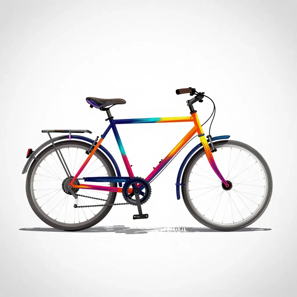 A vibrant bicycle frame with a glossy paint finish and a color gradient of blue, orange, pink, and yellow, illuminated by soft, diffused light from above. The clean white background provides ample copy space for design integration.