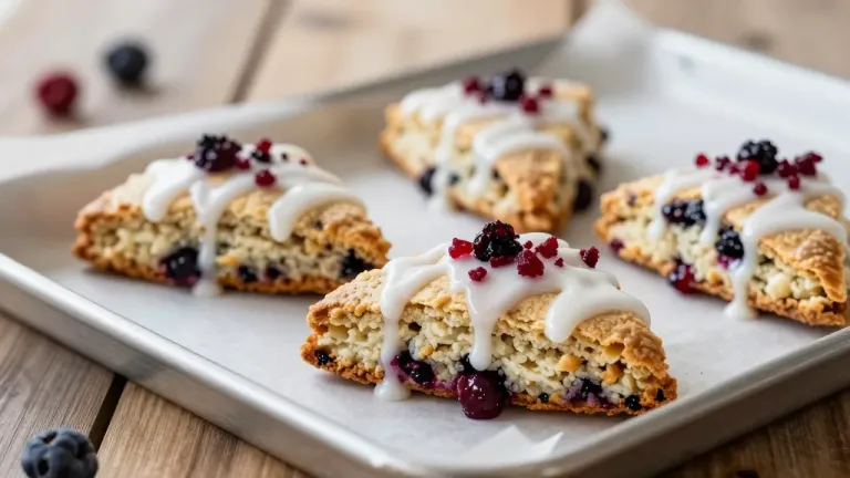 Golden-brown scone wedges with glossy icing and vibrant berries, bathed in warm, soft light that highlights their flaky texture and rich colors. The shallow depth of field and rustic wooden background create a homely and inviting atmosphere.