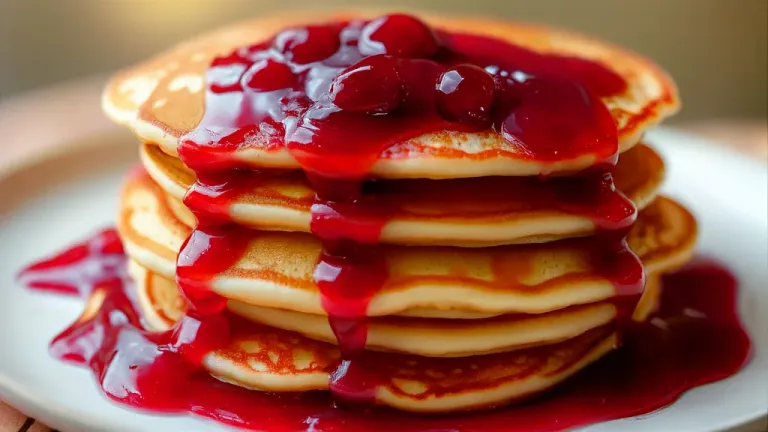 A close-up of a stack of golden pancakes topped with glossy cherry sauce, highlighted by warm ambient light that enhances the glossy sheen and texture, creating a sense of indulgence and abundance. The blurred, neutral background ensures the focus remains on the delectable stack.