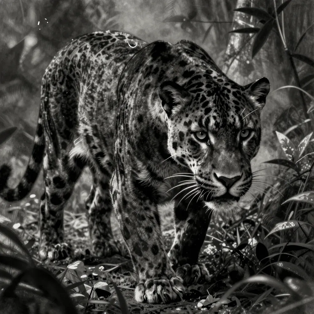 A clouded leopard crouches low, its glossy spots and coarse fur highlighted by diffused light filtering through the dense jungle foliage, creating a moody and secluded atmosphere. The shallow depth of field focuses on the leopard's face and upper body, emphasizing its intense gaze and the intricate details of its fur.
