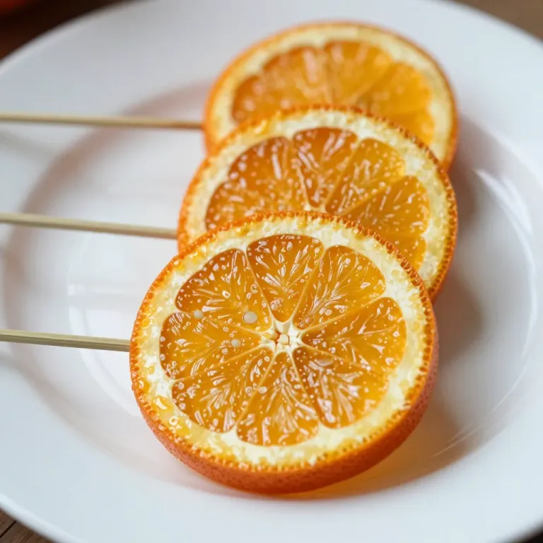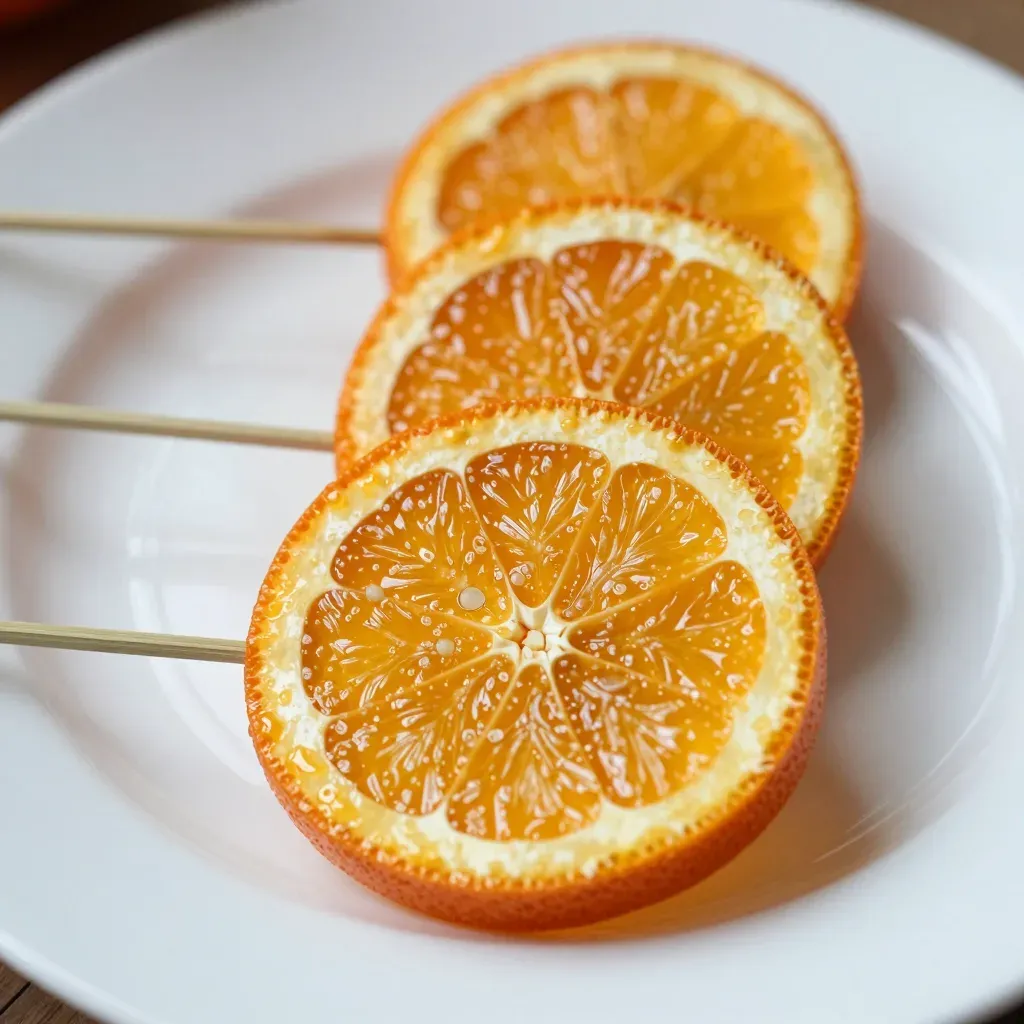 Three candied orange slices, each pierced with a wooden skewer, display a glossy sugar crust and translucent pulp, with a slightly puffed rind suggesting a crisp exterior and juicy interior. Soft, diffused overhead lighting creates highlights on the sugar glaze and segments, while a shallow depth of field and clean white plate background emphasize texture and layering with minimal distraction.