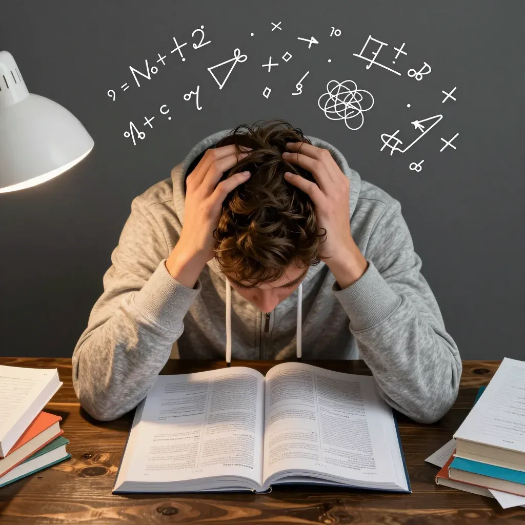 A student in a gray hoodie is deeply engrossed in studying at a wooden desk, surrounded by books and papers, with a focused desk lamp illuminating their face and the workspace. The shallow depth of field blurs the background, emphasizing the student and their immediate study materials.