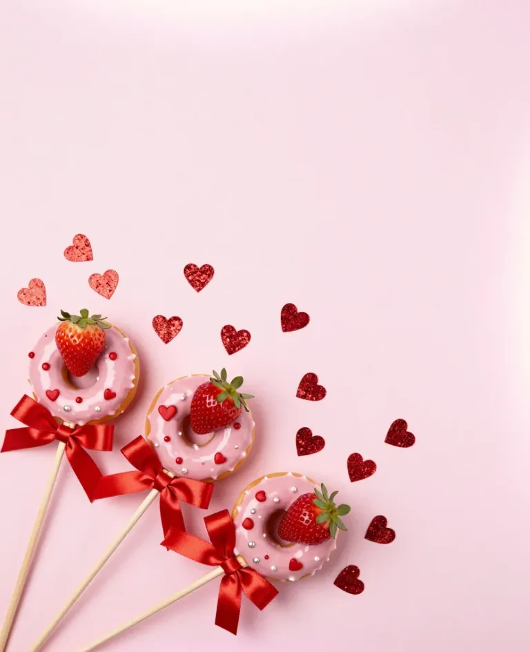 A flat lay of strawberry donuts on sticks, adorned with ribbons and red hearts, set against a soft pink gradient background. The gentle lighting highlights the glossy glaze and vibrant colors, creating a romantic and festive mood.